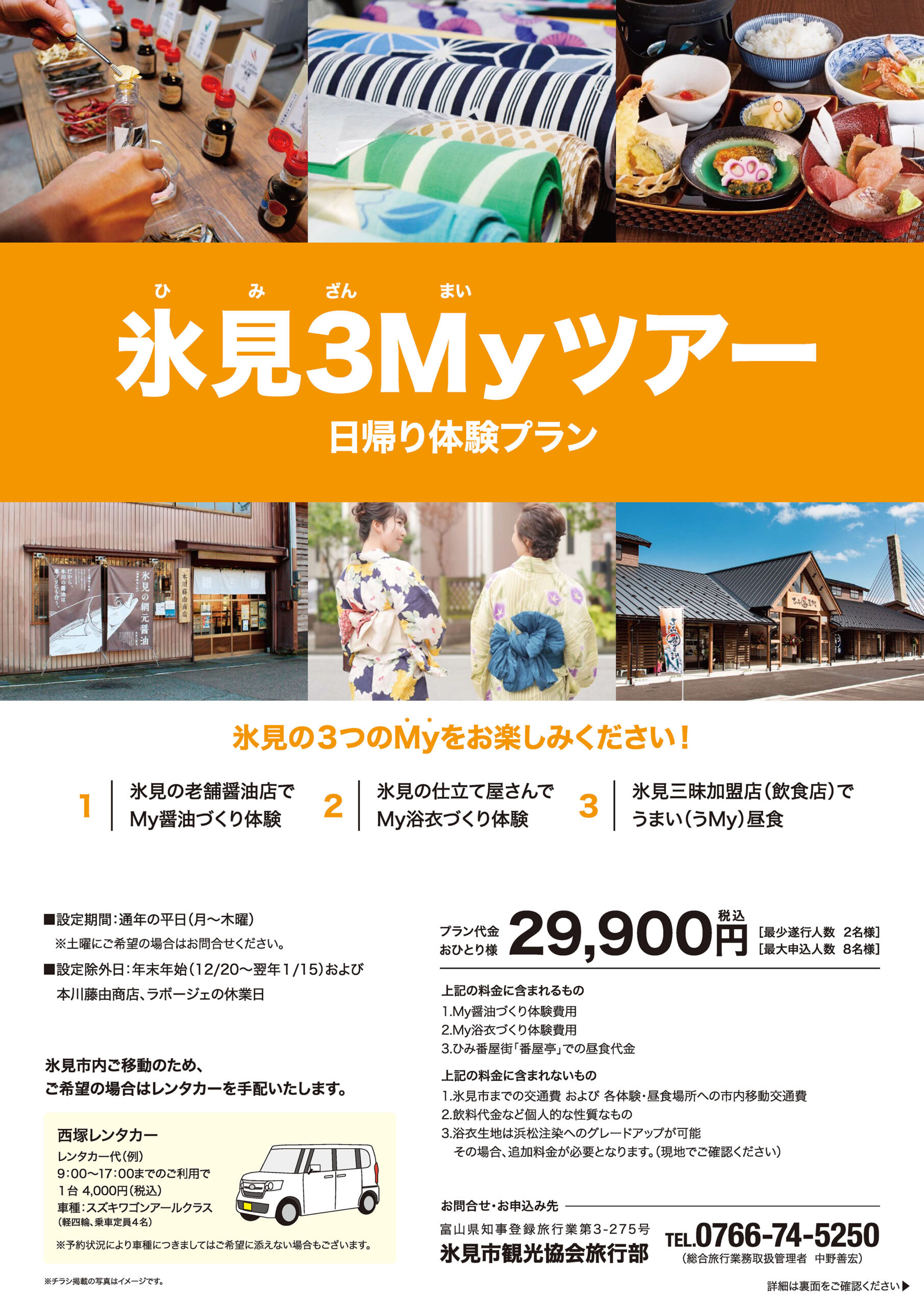| 料金 | おひとり様 29,900円(税込) ■上記の料金に含まれるもの1.My 醤油づくり体験費用 2.My 浴衣づくり体験費用 3.ひみ番屋街「番屋亭」での昼食代金 ■上記の料金に含まれないもの 1.氷見市までの交通費および各体験・昼食場所への市内移動交通費 2.飲料代金など個人的な性質なもの 3.浴衣生地は浜松注染へのグレードアップが可能 その場合、追加料金が必要となります。(現地でこ確認ください) |