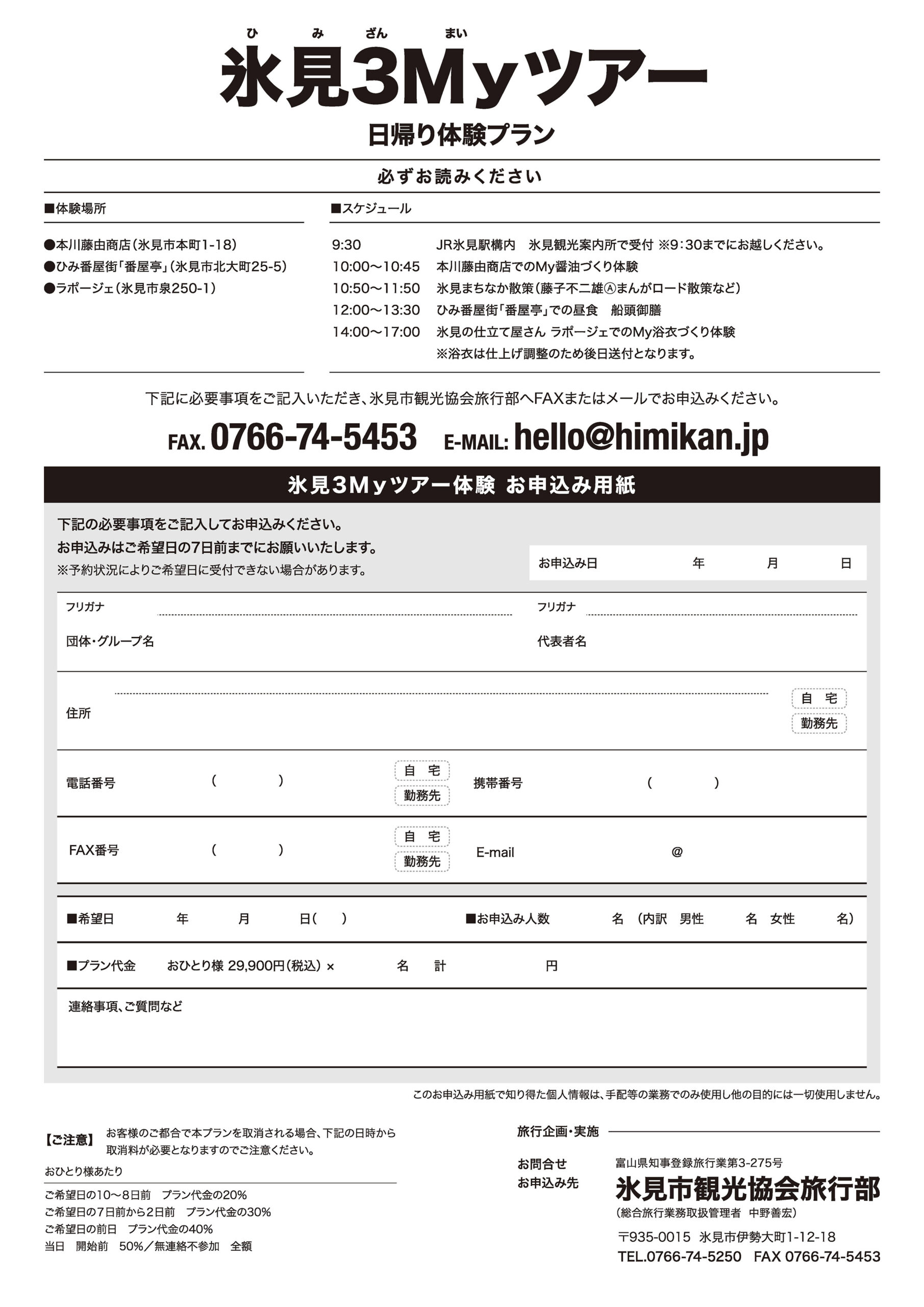 | ご予約 | 以下に必要事項をご記入の上、氷見市観光協会旅行部へFAXまたはメールでお申し込みください。 ■お申込書はこちら |