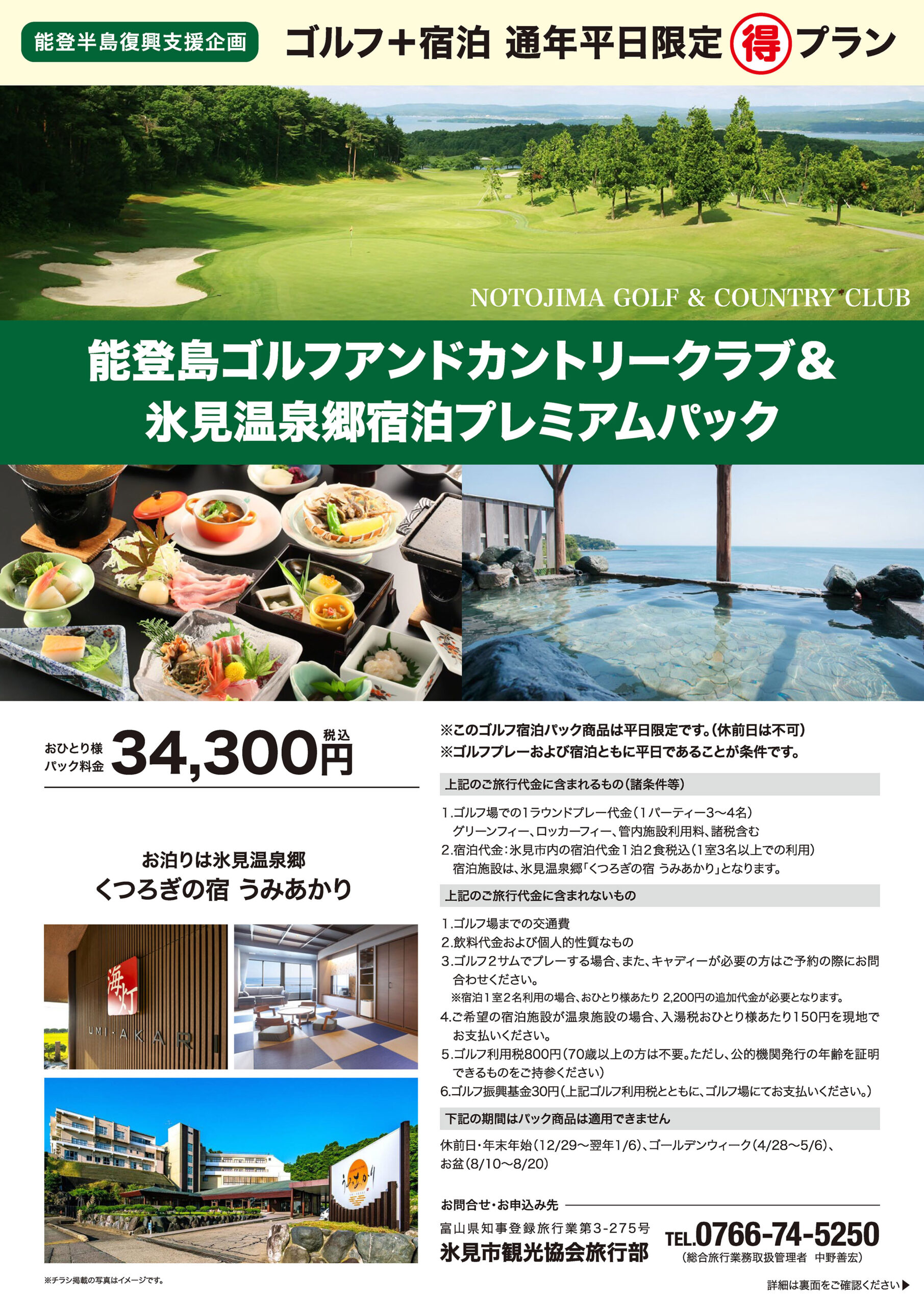 能登島ゴルフアンドカントリークラブ&氷見温泉郷「うみあかり」宿泊プレミアムパック