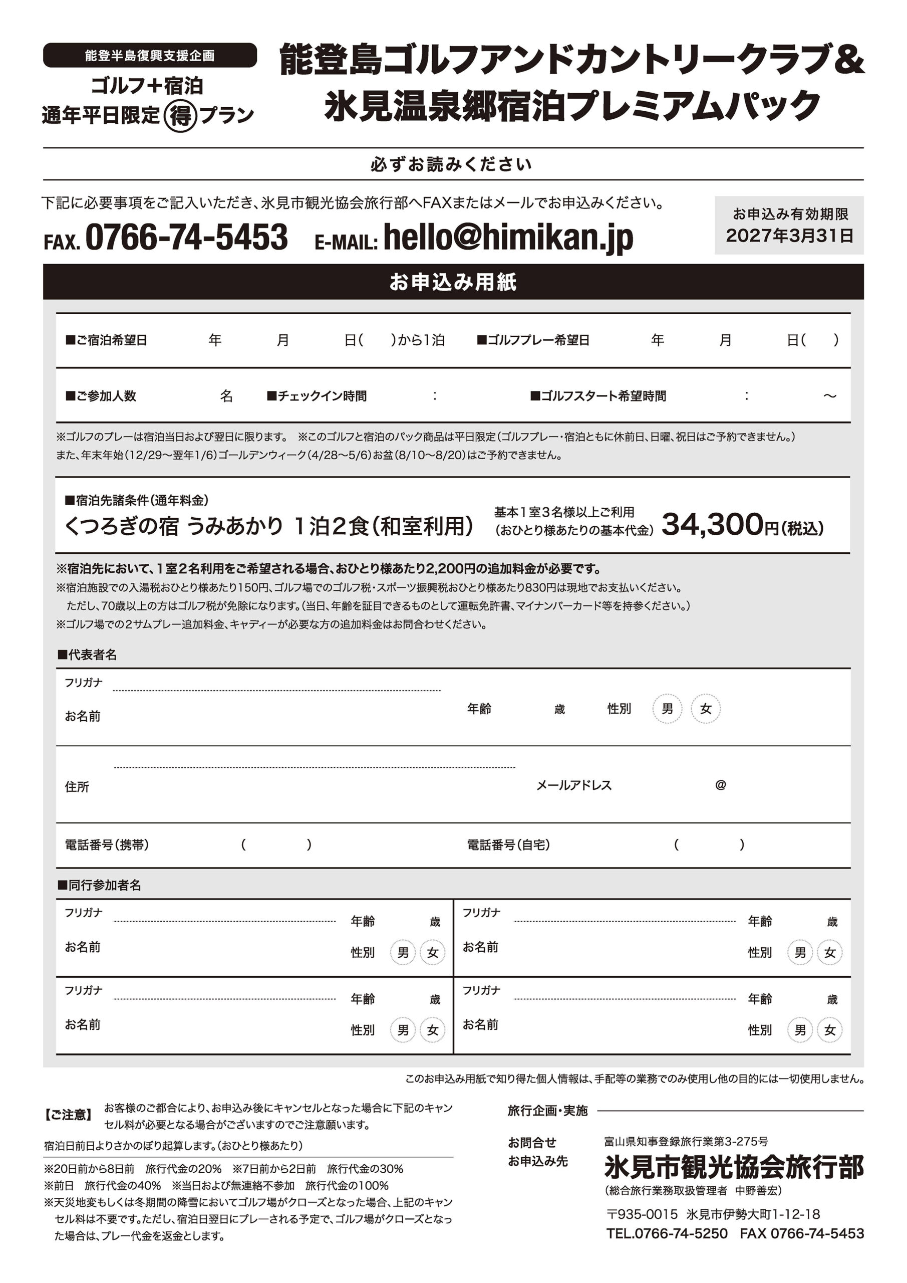 | ご予約 | 以下に必要事項をご記入の上、氷見市観光協会旅行部へFAXまたはメールでお申し込みください。 ■お申込書はこちら |